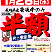 1月28日(水)は肉の感謝祭を開催します!! 壱岐牛を半額で販売いたします。 そのほかにもお買い得商品を取り揃えています。 皆様のご来店、お待ちしてます!!