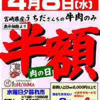 4月8日(水)は肉の日を開催します!! うちださんちの牛肉を半額で販売いたいします。 その他にもお買い得商品を取り揃えてお待ちしています!! 是非お越しくださいませ!!