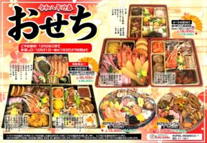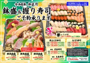 鮮魚の鉢盛り、鮮魚のお寿司、おせち料理は、いちやまにご予約ください!!